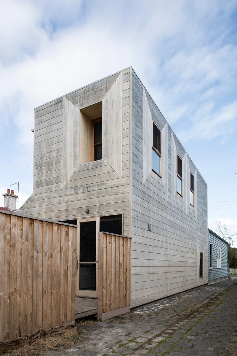 The adjacency to a bluestone laneway, busy road and tightly packed workers’ cottages made this two storey extension to a single fronted weatherboard cottage challenging. The proposal would have to treat the public realm with added respect as well as protect the family’s privacy and exposure to noise pollution. The project focuses on this boundary condition and how it could be harnessed and utilise the shared qualities of an exposed condition, providing both protection from the elements, privacy for daytime and evening tasks and give back to an area synonymous with a distinct lack of consideration for the public engagement.