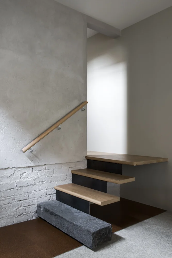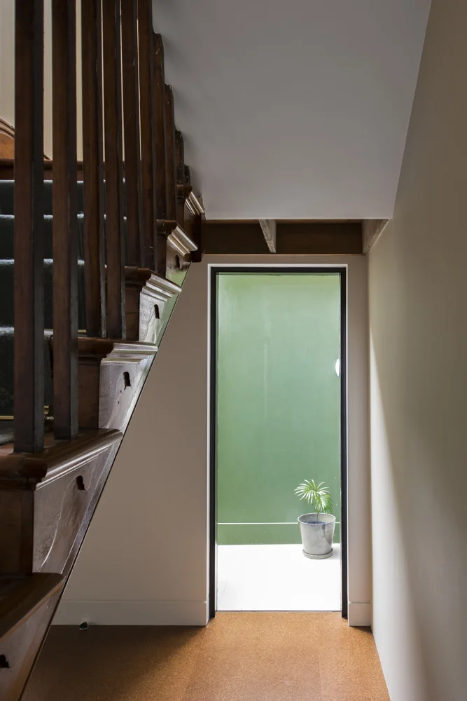The circulation of the new scheme promotes and celebrates the heritage staircase, following the removal of cupboards and stair additions, careful refurbishment of the staircase created enough space to transition underneath and experience the original structure and materials, combined with a non-competing new addition of timber, steel and glass balusters. Original brickwork and later steel additions have been exposed and promoted.