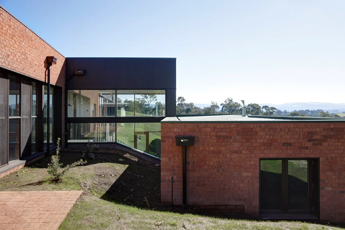 The heavy structural concrete wall on the west begins the placement of the upper building, connected by a steel structure, allowing for shallow long forms to follow the natural contours, with lighter weight inner areas falling away with the landscape. The new entrance splits the old and the new, with new solid brickwork connecting back to the existing residence. The upper connection with the existing building is based on material articulation and window size proportions.
